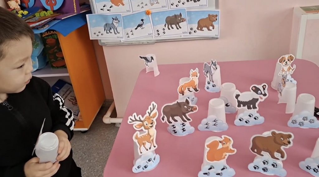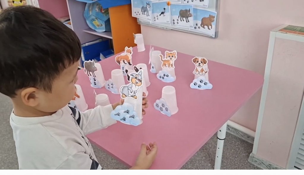 Ересек "Еркемай" тобының балалары "Қардағы іздер" ойынын ойнады. Ойынның мақсаты: Балалардың байқағыштығын дамыту. Логикалық ойлауын, салыстыру қабілетін жетілдіру. Қардағы жануарлар мен құстардың іздерін ажырата білуге үйрету.